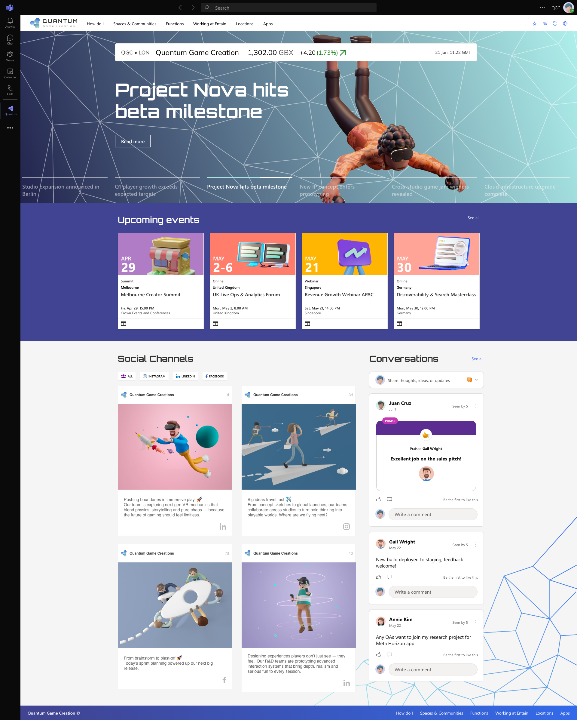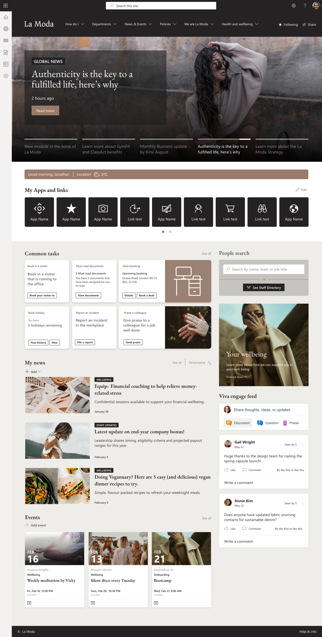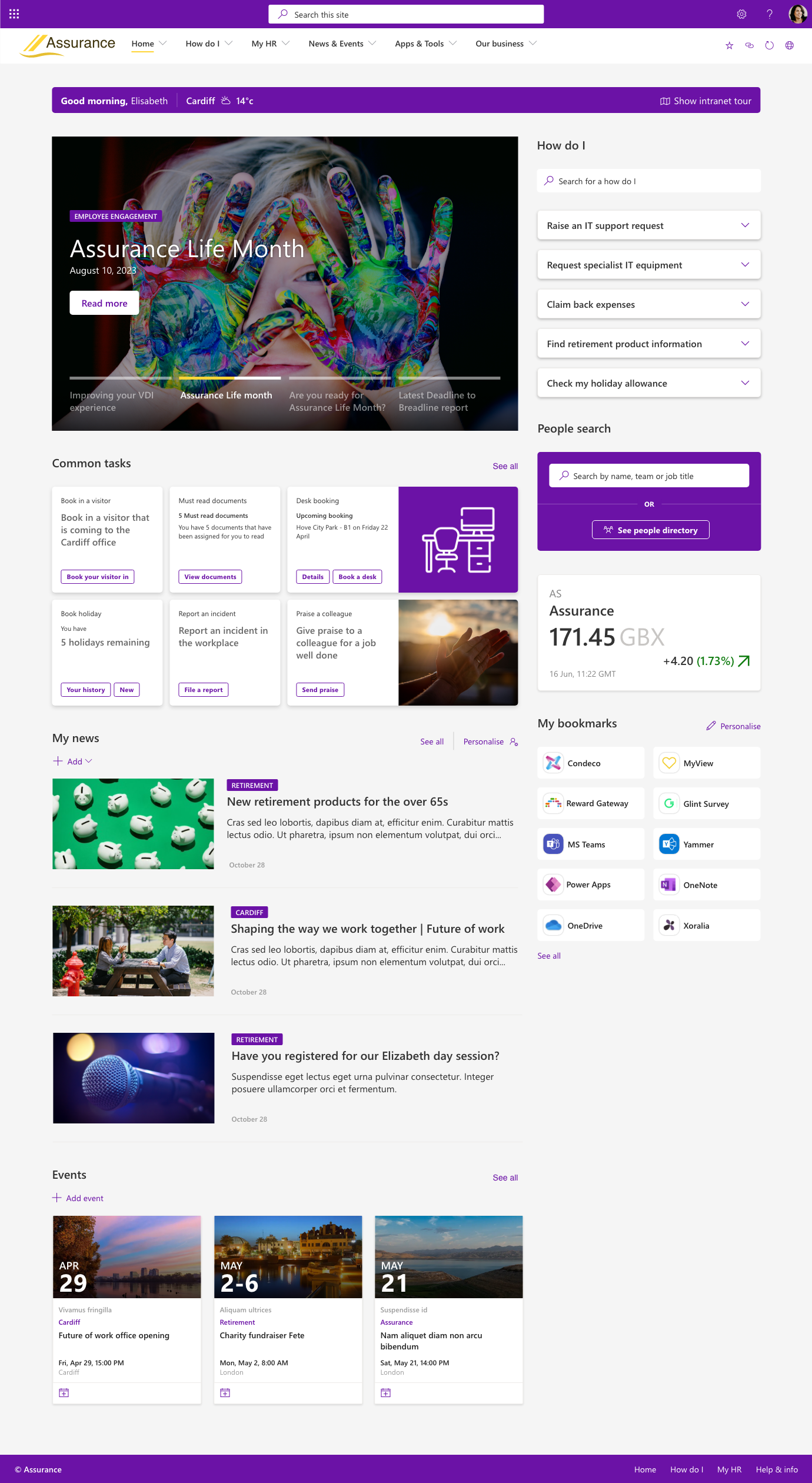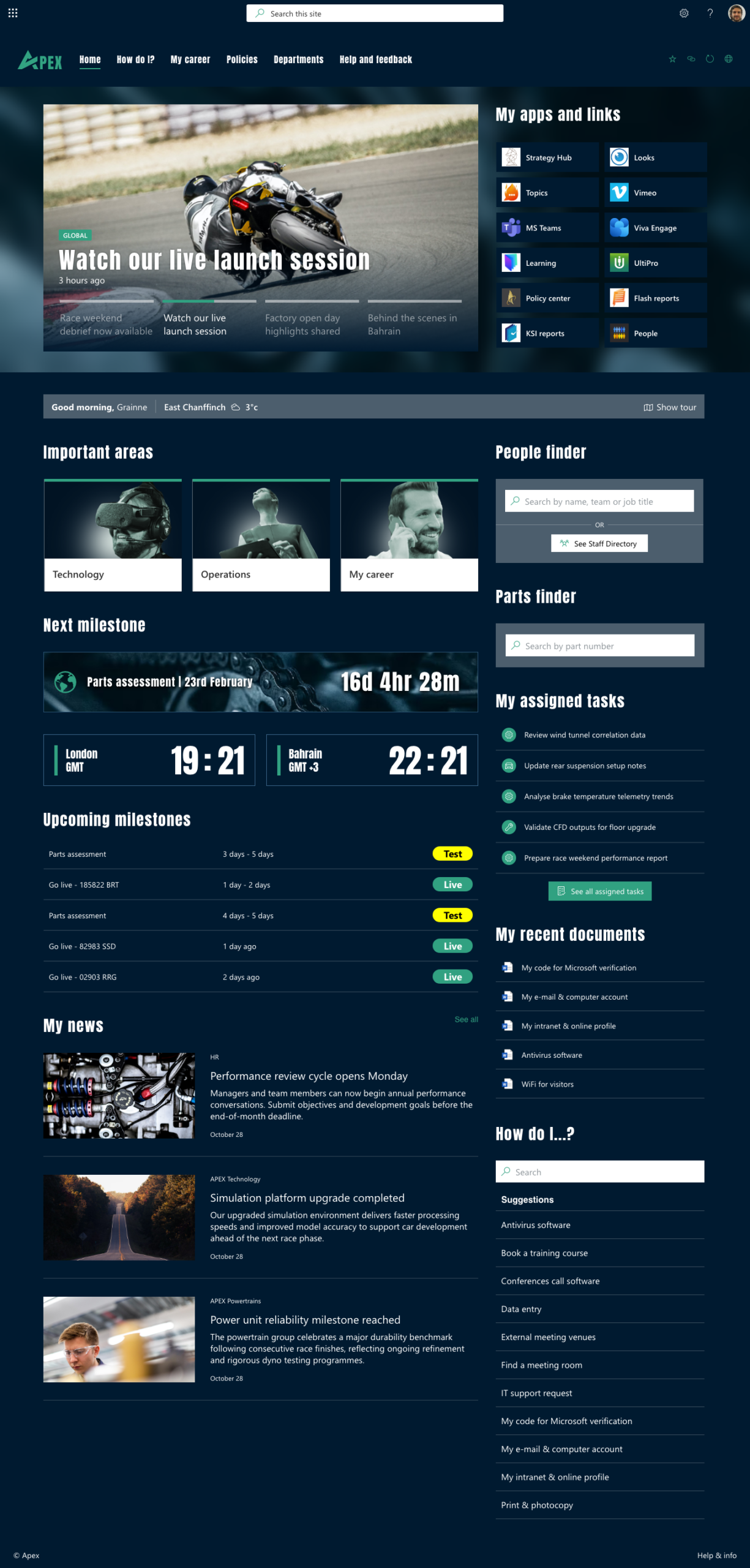 A “one stop shop” homepage created for Baringa Consulting that surfaces everything an employee needs for their working day – not only personalised news and events, but also most-used apps, important content areas, “how to” information, Viva Engage discussions and more.